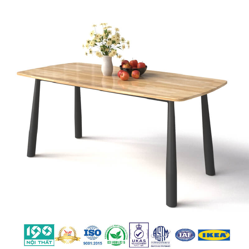 Bàn ăn chân sắt kiểu gậy bóng chày Sơn Đen sần hoặc màu Kem độc đáo. Mặt bàn gỗ cao su ghép thanh dày 20mm. Có 2 màu sơn gỗ: nâu cánh gián và vàng tự nhiên. Gỗ cao su có tính đàn hồi, dẻo dai, bền bỉ, không ngậm nước và không thấm nước, dùng lâu vẫn giữ được độ mềm mại, thanh thoát.