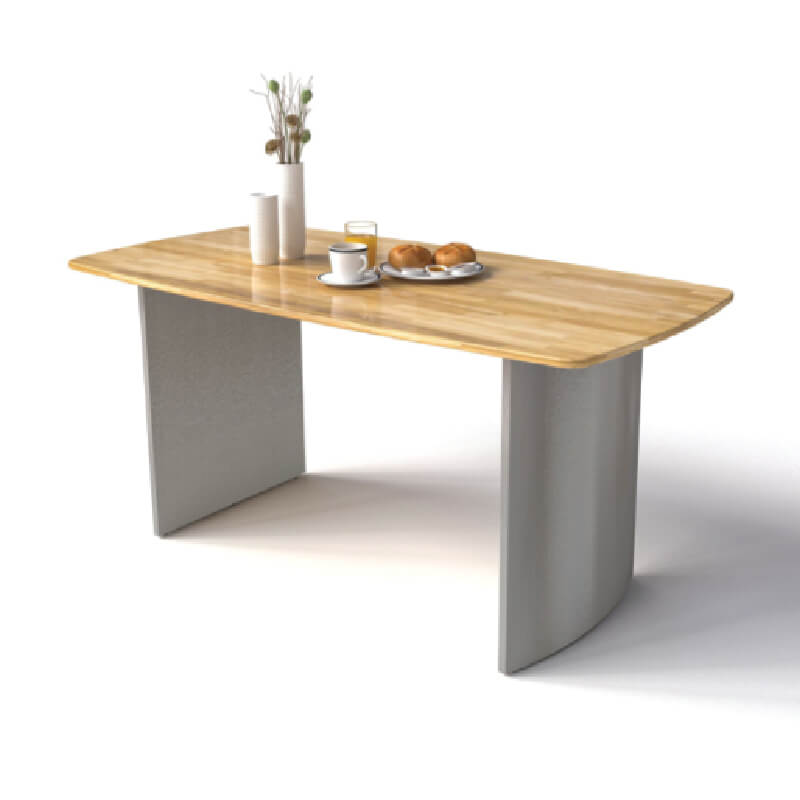 Bàn ăn chân làm từ inox tấm mờ màu ghi dập ép tạo hình chỏm cầu. Khung mặt bàn thép hộp 20x40 sơn đen sần. Mặt bàn gỗ cao su ghép thanh dày 20mm. Có 2 màu sơn gỗ: nâu cánh gián và vàng tự nhiên. Gỗ cao su có tính đàn hồi, dẻo dai, bền bỉ, không ngậm nước và không thấm nước, dùng lâu vẫn giữ được độ mềm mại, thanh thoát.