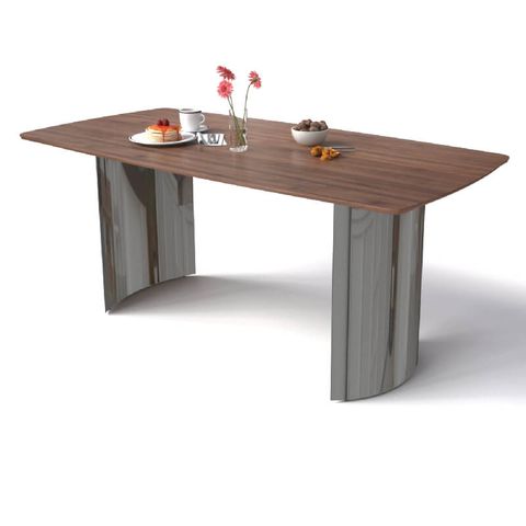 Bàn ăn chân làm từ inox tấm dập ép tạo hình bán nguyệt màu đen bóng. Khung mặt bàn thép hộp 20x40 sơn đen sần. Mặt bàn cốt gỗ plywood dày 18mm phủ melamin 2 mặt có độ cứng, độ bền cao, chống cong vênh hiệu quả, chống ẩm cực tốt phù hợp sử dụng lâu dài. Cạnh bàn vát chéo.