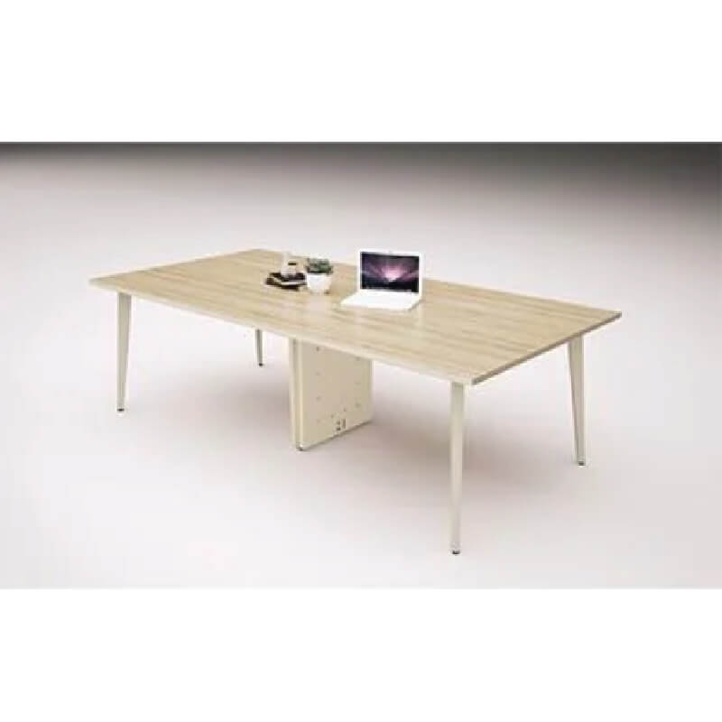 Bàn Họp Chân Sắt 1902BH24-KT dài 2.4m kiểu chân 1902, chân sắt tấm gấp, thanh giằng hộp 25x50 được liên kết với nhau bằng khớp nối nhôm, chân sắt sơn tĩnh điện màu kem, bàn có chân hộp kỹ thuật ở giữa. Bàn Họp Văn Phòng 1902BH24-KT có mặt bàn gỗ công nghiệp phủ Melamine dày 25mm sáng bóng.