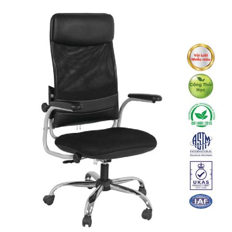 + Ghế xoay khung bằng thép mạ Crome, tựa cao có đệm gối đầu, đệm tựa bọc vải lưới kết hợp Da PU